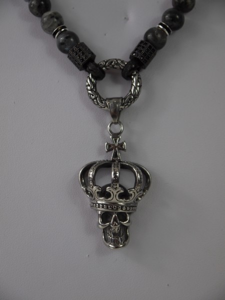 Halskette mit grauen Onyxsteinen sowie einem silbernen Totenkopf mit Krone Anhänger